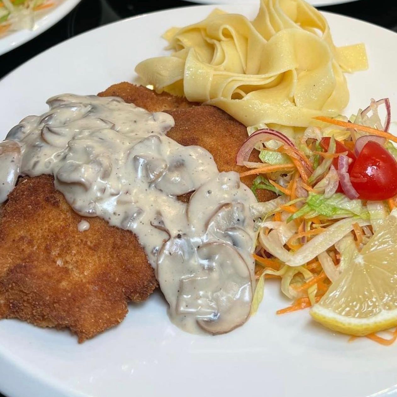 Chicken schnitzel with creamy mushroom sauce, pasta and, salad for $15