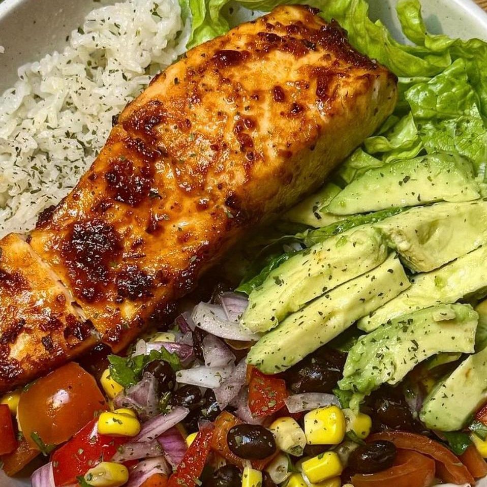 Fried Salmon, Rice, avocado, and salad for $15